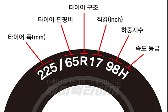 왼쪽부터 225 65 17 사이즈는 타이어 폭, 타이어 편평비, 타이어 구조, 직경, 하중 지수, 속도 등급이 되겠습니다.