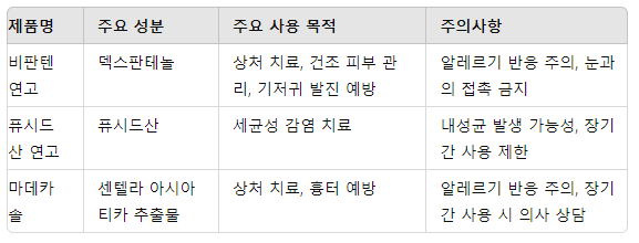 비판텐 연고는 피부 재생과 보습, 퓨시드산 연고는 세균성 감염치료에 적합, 마데카솔은 흉터 예방과 상처 치료에 사용됩니다.