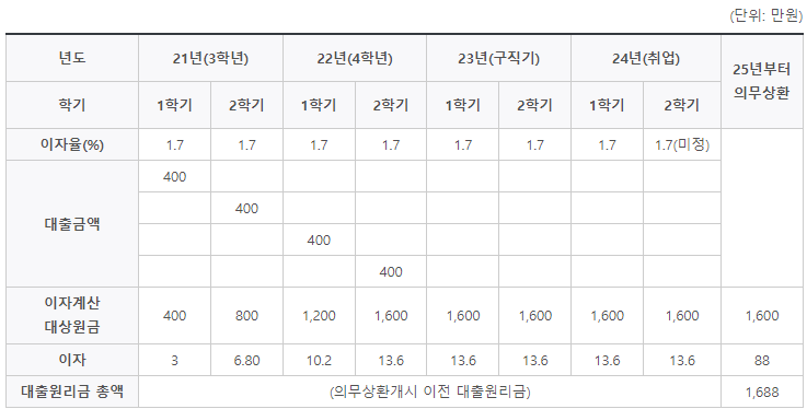 대출 원리금 계산 예시입니다. 2021년 (3학년)학생이 졸업할 때까지 총 1,600만원을 대출했을 경우2025년 1월 1일 기준 취업 후 상환 대출원리금 총액은 1,688만원입니다.