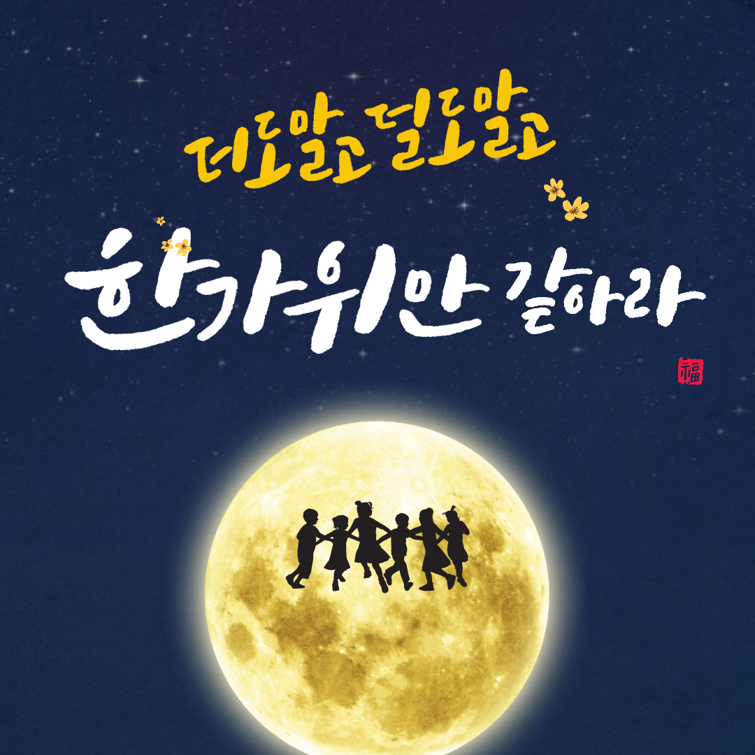 오랜만에 만나는 가족들과 따뜻한 시간 보내시고, 넉넉하고 행복한 한가위 되시길 바랍니다. 풍성한 보름달처럼 마음속 소원도 모두 이루어지길 기원합니다.